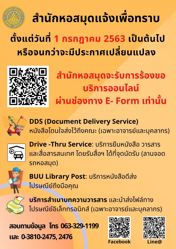 1. บริการสำเนาบทความวารสารที่มีในสำนักหอสมุด ซึ่งการให้บริการ “ บริการสำเนาบทความวารสารที่มีในสำนักหอสมุด (Journal Copy Service in Library) “ เป็นการให้บริการสำเนาบทความวารสารทั้งภาษาไทยและภาษาต่างประเทศที่มีในสำนักหอสมุด ในช่วงช่วงสถานการณ์การแพร่ระบาดของไวรัสโควิด 19 (เดือนมีนาคม – มิถุนายน 2563) ได้ดำเนินการให้บริการทั้ง คณาจารย์ นิสิต และบุคลากรมหาวิทยาลัยบูรพา ตั้งแต่เดือนกรกฎาคม 2563 เป็นต้นไป ให้บริการสำเนาบทความวารสาร เฉพาะคณาจารย์ และบุคลากรมหาวิทยาลัย โดยไม่เสียค่าใช้จ่าย