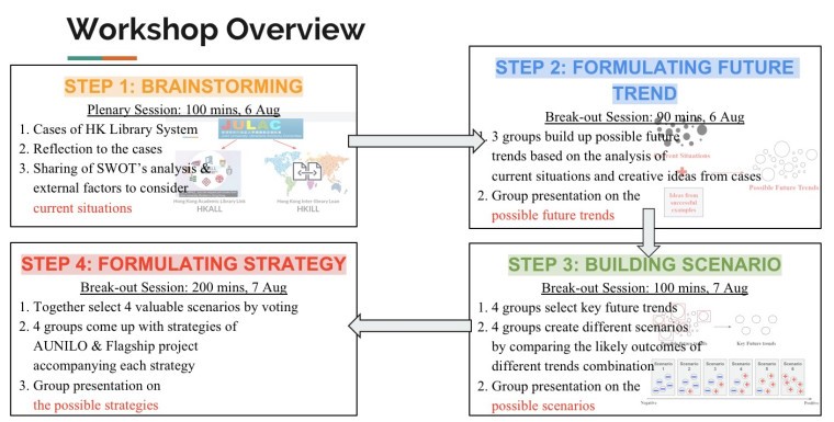ขั้นตอนที่ 1: Brainstorming ชมวิดีทัศน์แนะนำเครือข่ายห้องสมุดมหาวิทยาลัยฮ่องกง JULAC (Joint University Librarians Advisory Committee) HKALL (Hong Kong Academic Library Link) HKILL (Hong Kong Inter-library Loan) เพื่อเป็นกรณีศึกษาถึงแนวทางที่จะนำมาใช้กับ AUNILO จากนั้นเป็นการระดมสมองทำ SWOT Analysis โดยให้ผู้เข้าร่วมประชุมแบ่งออกเป็น 3 กลุ่ม ได้แก่ Apple, Orange, Banana แล้วให้แต่ละกลุ่มร่วมกันทำ SWOT หรือการวิเคราะห์จุดแข็ง จุดอ่อน ซึ่งเป็นปัจจัยภายใน และปัจจัยภายนอกที่จะมีผลกระทบทำให้เกิด Opportunity และ Treat โดยให้คำนึงถึง Unit of Analysis ตั้งแต่ระดับมหาวิทยาลัย ระดับประเทศ ไปจนถึงระดับ AUNILO ในภาพรวม หลังจากนั้น แต่ละกลุ่มส่งตัวแทนนำเสนอผลการวิเคราะห์ SWOT ต่อที่ประชุม